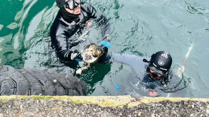 Mazgaldan düşerek iskele altına giren kedinin kurtarılması için iki kişilik su altı kurtarma timi suya girerken, iki kişilik grup de botla takviye verdi.