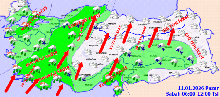 Rüzgarın; Marmara, Ege, Akdeniz, İç Anadolu’nun güney ve doğusu, Orta ve Doğu Karadeniz’in iç kısımları ile Doğu Anadolu’nun kuzey ve batısında güneyli taraflardan vakitle Marmara’nın batısında kuzeyli taraflardan kuvvetli ve yer yer fırtına (50-80 km/saat) halinde esmesi beklendiğinden ağaç ve direk devrilmesi, çatı uçması, soba ve doğalgaz kaynaklı baca gazı zehirlenme riski ile ulaşımda aksamalar üzere aksiliklere karşı dikkatli ve önlemli olunması gerekmektedir.