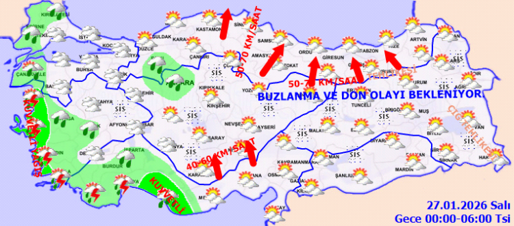 Denizlere yönelik yapılan ikazda ise Doğu Karadeniz’in batısı (Sinop-Samsun) ile Güney Ege’de fırtına beklendiği açıklandı. Doğu Karadeniz’de rüzgarın 27 Ocak Salı sabahından itibaren 6 ila 8 kuvvetinde (50-75 km/saat) eseceği ve öğlen saatlerinden sonra tesirini kaybedeceği belirtildi. Güney Ege’de ise fırtınanın akşam saatlerine kadar sürmesi bekleniyor.
