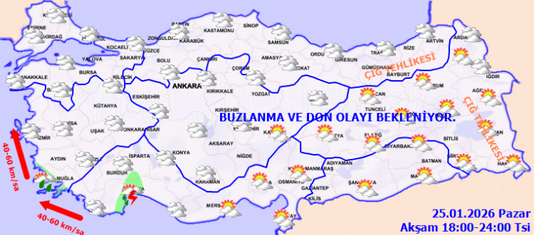 ANKARA (İGFA) – Meteoroloji Genel Müdürlüğü, 25 Ocak Pazar gününe ait hava kestirim raporunu yayımladı.