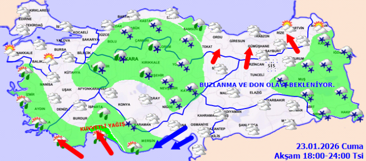 ANKARA (İGFA) – Meteoroloji Genel Müdürlüğü, 23 Ocak Cuma gününe ait son varsayımlarını duyurdu.